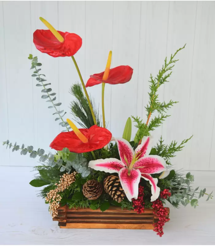 Centro de mesa navideño elegante elaborado con anturios rojos, lilium y follajes naturales, complementado con piñas decorativas. Presentado en una caja de madera clara, ideal para mesas principales.
