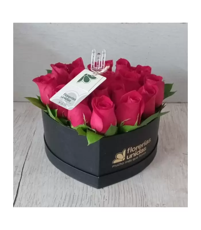 Celebra el amor con nuestro box corazón que contiene 18 rosas rojas y follaje fresco. Descubre la pasión floral de Florerías Unidas en cada composición.