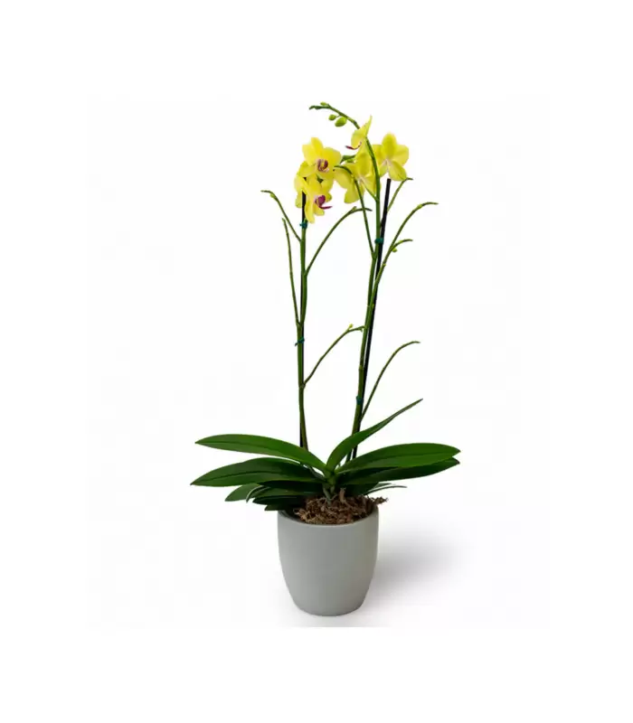 Amor “Purpura” “Blanco” “Amarillo” Nuestra Orquídea Phalaenopsis en base de cerámica blanca con doble tallo destaca por su intenso color púrpura, símbolo de admiración profunda