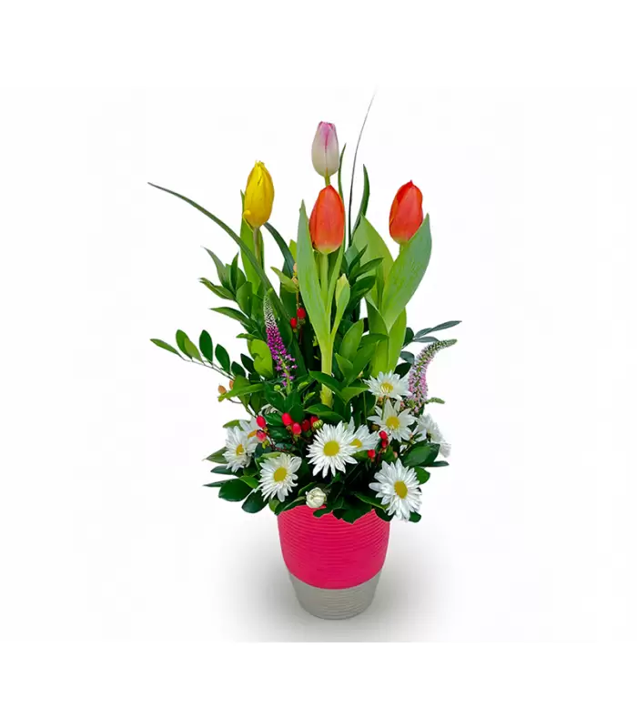 Lleva la frescura de un jardín a su hogar. Un arreglo que destaca por la elegancia de sus tulipanes en tonos cálidos y toques de follaje silvestre. El detalle perfecto para enviar un mensaje de felicidad este 14 de febrero.