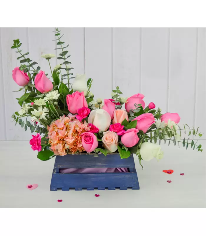 Sorprende con la ternura de este diseño floral. Una combinación fresca de rosas rosadas y margaritas en un box blanco impecable, decorada con un lazo. Es el regalo ideal para transmitir cariño y alegría de una forma...