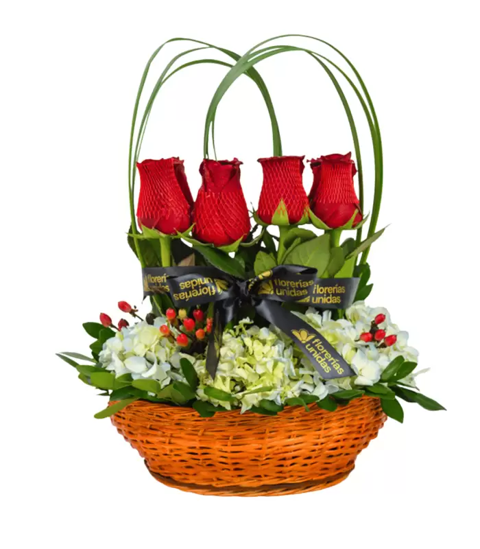 La calidez del mimbre se une a la intensidad de nuestras rosas rojas y la suavidad de las hortensias blancas para crear un regalo inolvidable. Perfecto para celebrar el amor en todas sus formas.